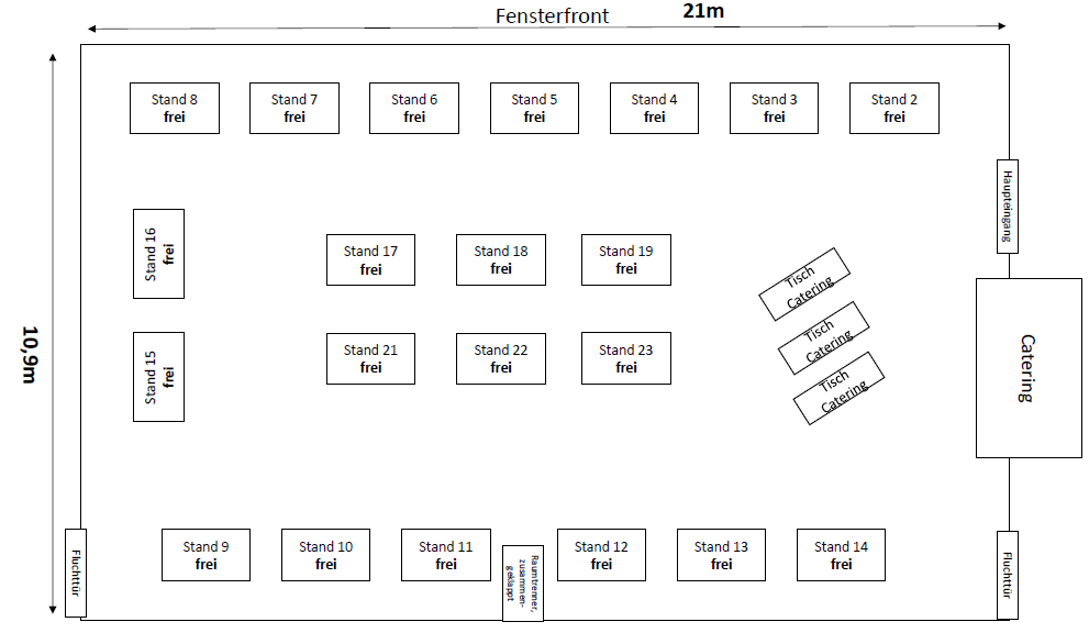Hier seht ihr den geplanten Grundriss mit den Messetischen.